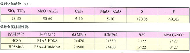 配合不同的焊絲(如H08A、H08MnA、H08MnMoA,H10MnSi)。可焊接低碳鋼,低合金鋼及壓力容器用鋼,適應較快速度薄板的焊接,如煤氣鋼瓶、鍋爐廠膜式水冷壁等部位的焊接。