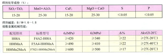 配合不同的焊絲H08A、H08MnA、H08Mn2MoA可使用于低碳鋼及低合金鋼、細(xì)晶粒鋼、鍋爐壓力容器。船體結(jié)構(gòu)、16Mn鋼結(jié)構(gòu)的焊接,也可用與X52、X60、X65級(jí)管線鋼的快速焊接,可進(jìn)行不同強(qiáng)度級(jí)別高強(qiáng)鋼厚壁結(jié)構(gòu)的焊接。也可用于多絲埋弧焊,特別適用于大直徑容器的雙面單道焊,是螺旋焊管專用燒結(jié)焊劑。