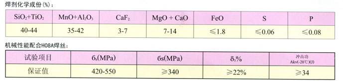 配合H08A、H08MnA、H10Mn、H10MnSi等焊絲,焊接低碳鋼及某些低合金鋼(如16Mn、15Mn、Q235、20G、18Nb、14MnNb)結構,可用于焊接船舶、鍋爐、低壓容器等,也可以用于電渣焊及銅的焊接。